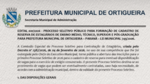 Prefeitura de Ortigueira abre processo seletivo para estagiários com bolsas de até R$ 2 mil 05/02/2026