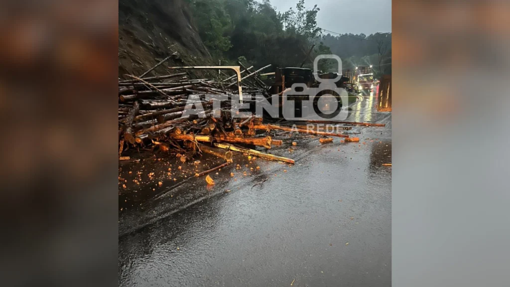 Na manhã desta sexta-feira, 11 de outubro, um caminhão carregado com toras de madeira tombou na rodovia PR-340, entre Telêmaco Borba e a unidade PUMA da Klabin, nas proximidades da Mineropar. O acidente bloqueou ambos os sentidos da via, espalhando a carga pela pista.
