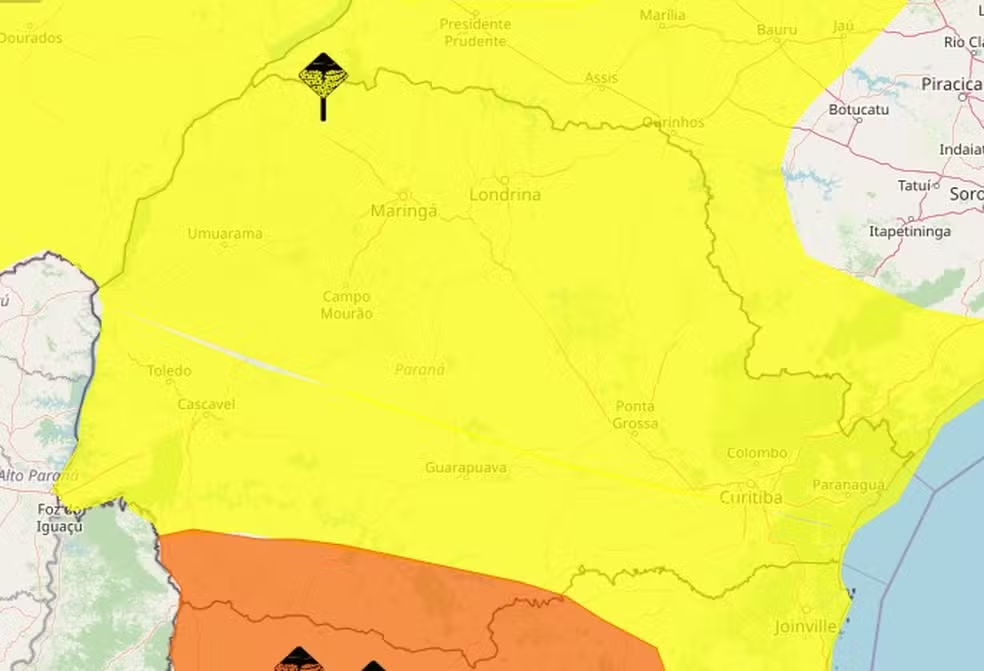O Instituto Nacional de Meteorologia (Inmet) emitiu três alertas de tempestade para o Paraná nesta terça-feira (15). Os avisos incluem a possibilidade de ventos intensos, com velocidades variando entre 40 km/h e 100 km/h, além de chuva forte e risco de queda de granizo. As regiões mais afetadas são o Sudoeste e o Centro-Sul do estado.