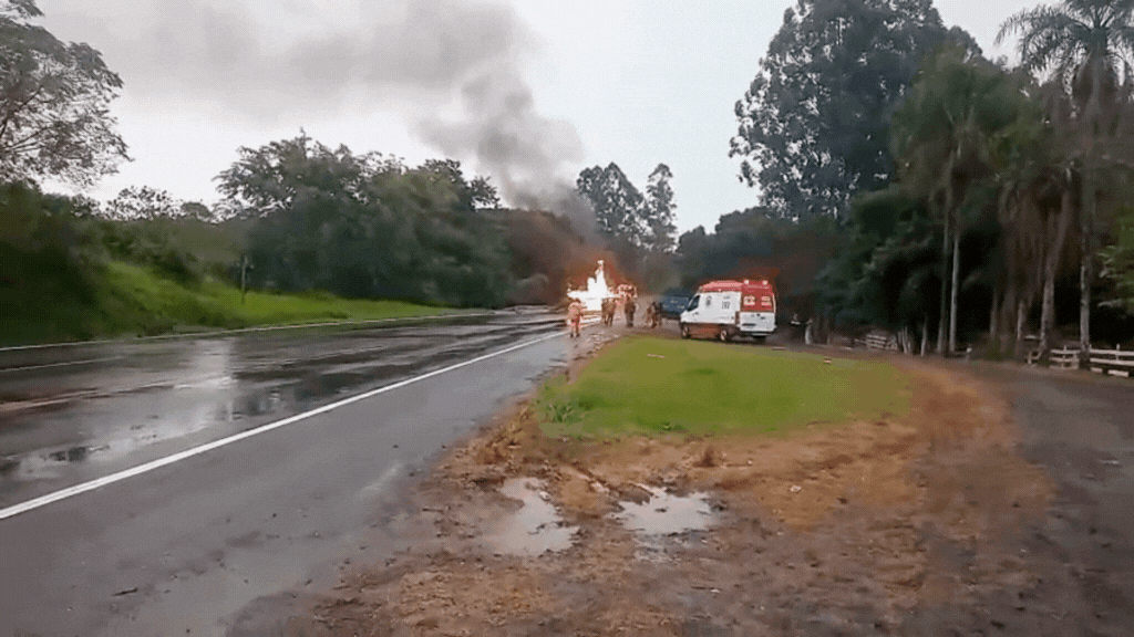 Logo após o tombamento, o veículo foi tomado pelas chamas. O Corpo de Bombeiros de Telêmaco Borba foi acionado imediatamente para controlar o fogo e evitar riscos maiores na área.