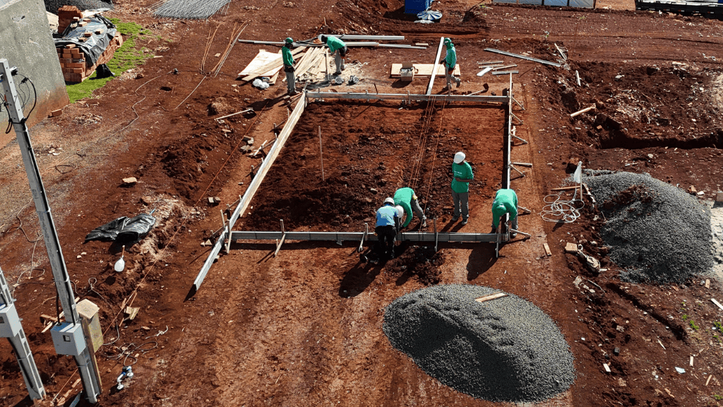 A primeira fase da obra é justamente a fundação rasa, que já recebe as instalações elétricas, hidráulicas e de gás embutidas. As casas terão sala, cozinha, dois quartos, banheiro e área de serviço, com tamanhos variando entre 45 m² e 50 m². Após a cura do concreto, a próxima etapa é a montagem das paredes, que chegam prontas.