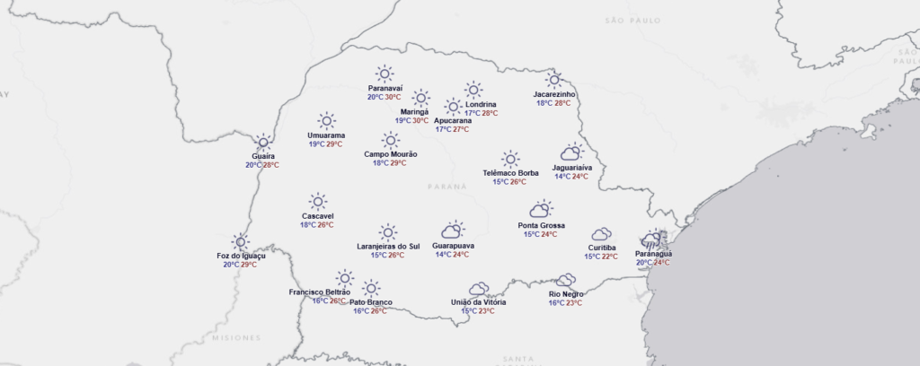 Já na faixa norte do Paraná, o domingo continuará com sol forte e aquecimento acentuado, mantendo as máximas em torno dos 30°C. As chuvas devem perder intensidade à medida que o sistema se desloca em direção à região leste e ao litoral.