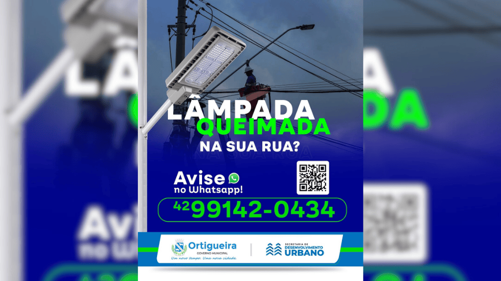 A Prefeitura de Ortigueira está recebendo solicitações de reparo de lâmpadas queimadas da iluminação pública por meio do WhatsApp. O serviço, oferecido pela Secretaria de Desenvolvimento Urbano, tem o objetivo de agilizar o atendimento e garantir a segurança nas ruas do município. Para informar sobre uma lâmpada queimada, basta enviar uma mensagem para o número (42) 9 9142-0434 ou utilizar o QR code disponível nas divulgações da prefeitura.