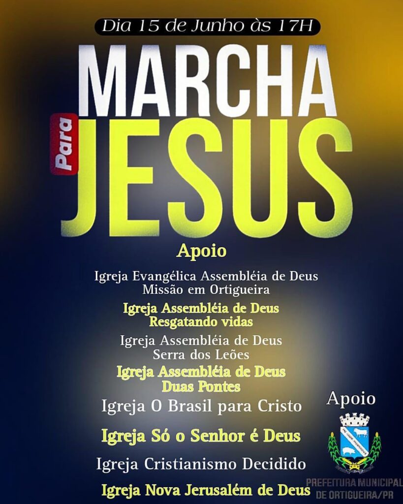 A cidade de Ortigueira se prepara para receber milhares de fiéis na próxima Marcha para Jesus, que acontecerá na tarde de hoje, sábado (15), às 17h, com início na Praça da Bíblia, na Avenida Brasil. O evento, que contará com o apoio da Prefeitura Municipal e diversas igrejas evangélicas, promete unir a comunidade em um momento de fé, comunhão e louvor.