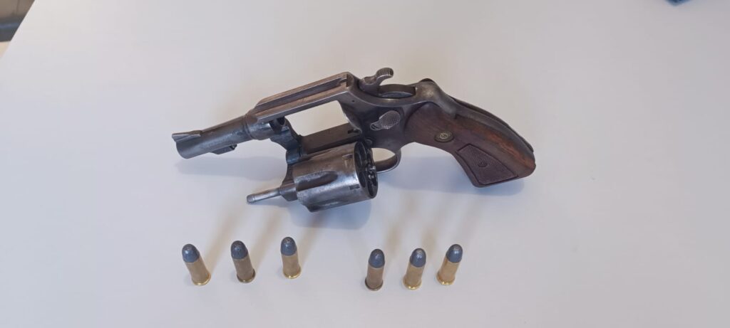 Na chegada, a equipe de área já havia feito o primeiro contato e aguardava reforço. A denúncia partiu de uma aluna, que informou que um colega estava em posse de um revólver calibre .38, marca Taurus, com seis munições intactas.