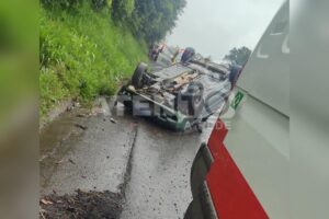 Acidente com capotamento na BR-376 em Imbaú deixa dois feridos. Populares denunciam buraco no local como causa de recorrentes acidentes.