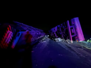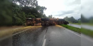 Caminhão carregado de soja tomba na BR-376 entre Tibagi e Ponta Grossa; motorista embriagado foi preso e pista segue interditada.