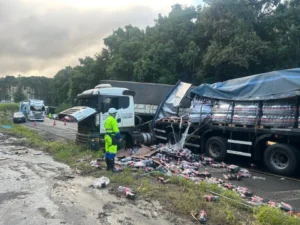 Um acidente entre dois caminhões na BR-376, próximo a Palmeira, causa bloqueio parcial e congestionamento. Trânsito segue pelo acostamento sem previsão de liberação total.