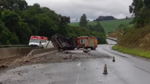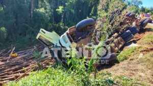 Acidente com caminhão carregado de toras na PR-340 mobiliza equipes de resgate e causa impacto no trânsito; motorista foi atendido e passa bem.