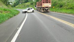 Acidente na PR-340 entre Telêmaco Borba e Ortigueira deixa motorista ferido. Óleo na pista foi a causa da colisão entre carro e caminhão.