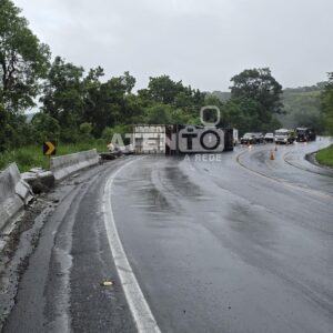 Caminhão tomba na PR-340, em Ortigueira, mas motorista escapa ileso. Autoridades investigam as causas do acidente ocorrido na tarde de domingo (8).