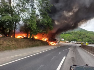 Acidente na BR-277 em Morretes envolve caminhão tanque, carros e outro caminhão, causando incêndio e bloqueio total da pista. Não há vítimas graves.