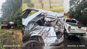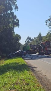 Grave acidente na BR-153 em Tibagi envolve colisão frontal entre um Honda City e um caminhão. Defesa Civil e SAMU prestam atendimento, mas vítima não