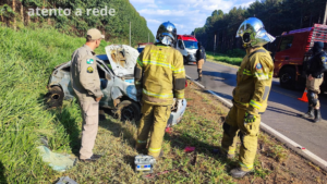 Acidente na PR-160 neste sábado, 06 de julho: GM Celta capota e sofre princípio de incêndio. Polícia Militar, SAMU e Bombeiros controlam a situação. Duas