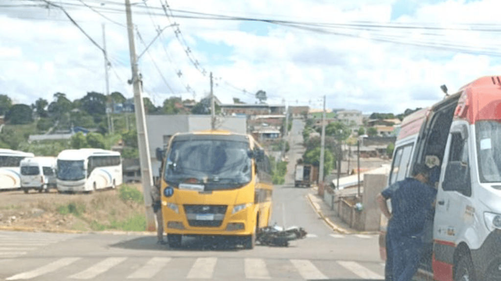 Um acidente envolvendo um ônibus escolar e uma motocicleta ocorreu no cruzamento das ruas Paulo Siqueira e Ivan Ferreira. Imagens enviadas por leitores mostram a motocicleta caída no asfalto, logo em frente ao veículo de transporte estudantil amarelo. Uma ambulância da equipe de socorro médico já estava no local realizando o atendimento da ocorrência. Não há informações de vítimas.