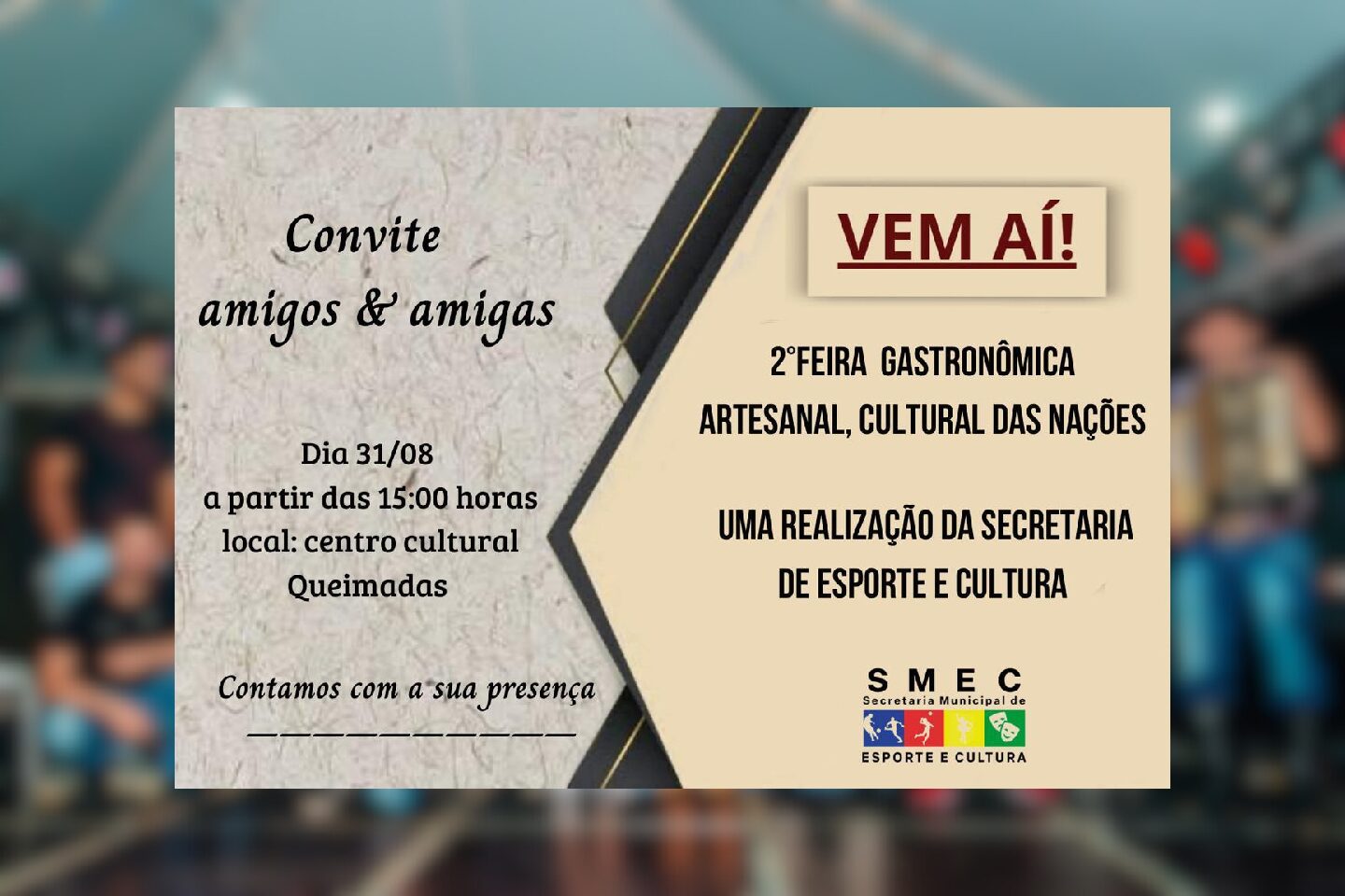 No dia 31 de agosto, a partir das 15 horas, o Centro Cultural de Queimadas será o palco da Feira Cultural Artesanal e Gastronômica das Nações.