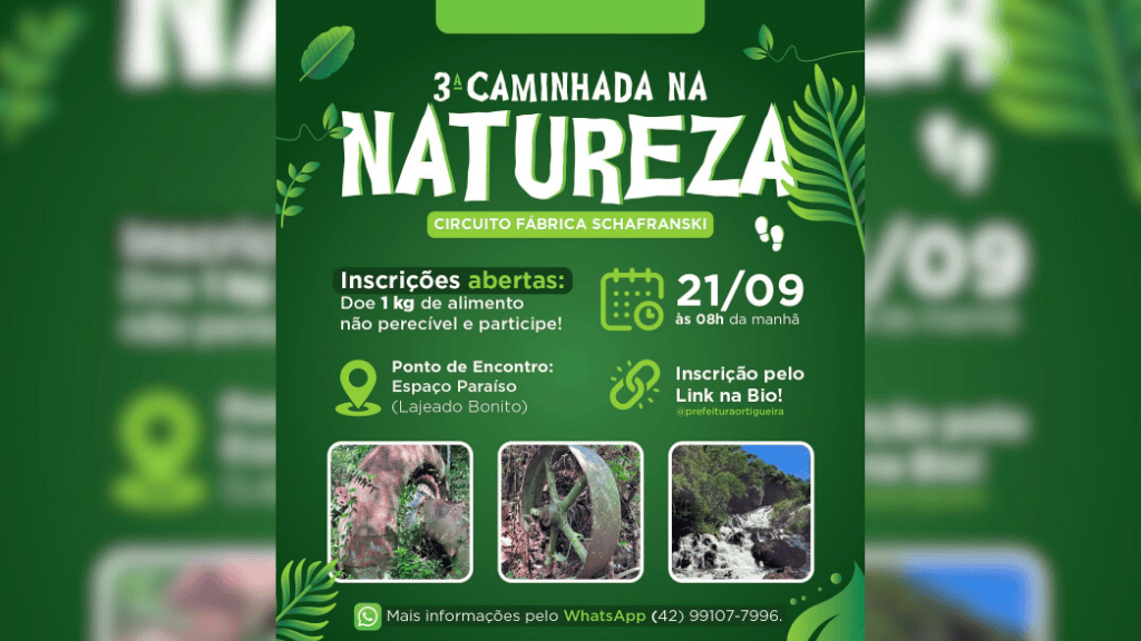 A 3ª Caminhada da Natureza de Ortigueira acontecerá no dia 21 de setembro, prometendo uma experiência única em meio à natureza exuberante da região. O evento, que busca incentivar o contato direto com o meio ambiente, terá um percurso de 16 km, com partida entre 8h e 8h30 do Espaço Paraíso – Lageado Bonito.