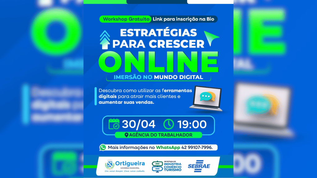 A Prefeitura de Ortigueira, por meio da Secretaria de Indústria, Comércio e Turismo, uniu forças com o Sebrae para promover uma capacitação essencial para o comércio local. O workshop gratuito “Estratégias para Crescer Online – Imersão no Mundo Digital” tem o objetivo claro de ensinar os empreendedores da cidade a utilizarem as ferramentas virtuais para atrair mais clientes e aumentar o volume de vendas.