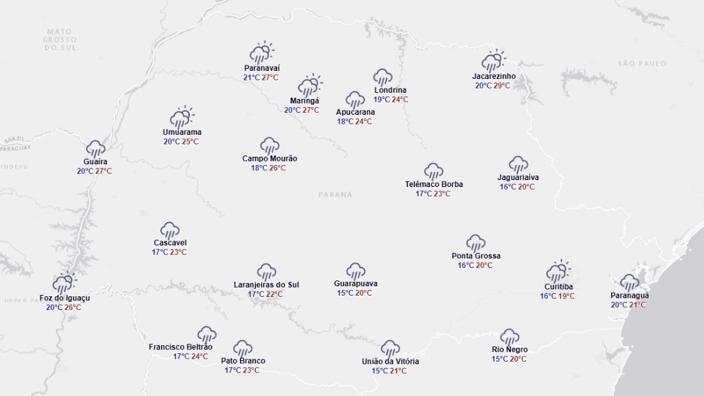 A mudança no tempo começa entre sábado e domingo (26). A aproximação do sistema trará chuva inicialmente para as metades Oeste e Sul do Paraná. Na segunda-feira (27), a instabilidade deve se espalhar por todo o estado.ado e céu encoberto nas duas cidades. A previsão indica que as temperaturas máximas devem ficar estáveis, em torno de 27°C, com mínimas de 17°C, ainda sem expectativa de chuva significativa.