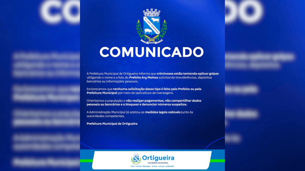 A Prefeitura Municipal de Ortigueira emitiu um alerta urgente sobre a ação de criminosos que estão utilizando o nome e a foto do prefeito Ary Mattos para aplicar golpes. Os estelionatários entram em contato via aplicativos de mensagens solicitando transferências bancárias, depósitos ou dados pessoais dos moradores.
