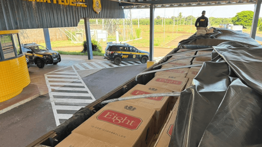 A Polícia Rodoviária Federal (PRF) realizou uma apreensão milionária de contrabando na manhã desta sexta-feira (13). As equipes retiraram de circulação cerca de 600 mil maços de cigarros de origem paraguaia na região de Umuarama. Todo o material ilícito viajava escondido nos compartimentos de carga de um caminhão do tipo bitrem.