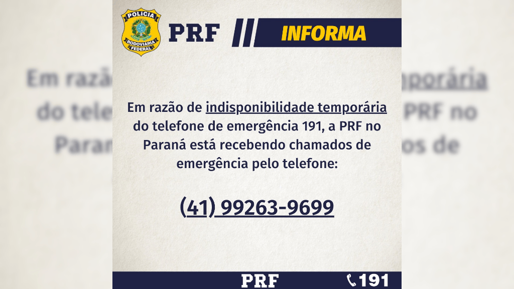 A Polícia Rodoviária Federal (PRF) no Paraná informa que seu telefone de emergência 191 está temporariamente indisponível. Por esse motivo, a corporação divulgou um número alternativo para a população fazer chamados de urgência nas rodovias federais do Estado. O número para contato é o (41) 99263-9699.
