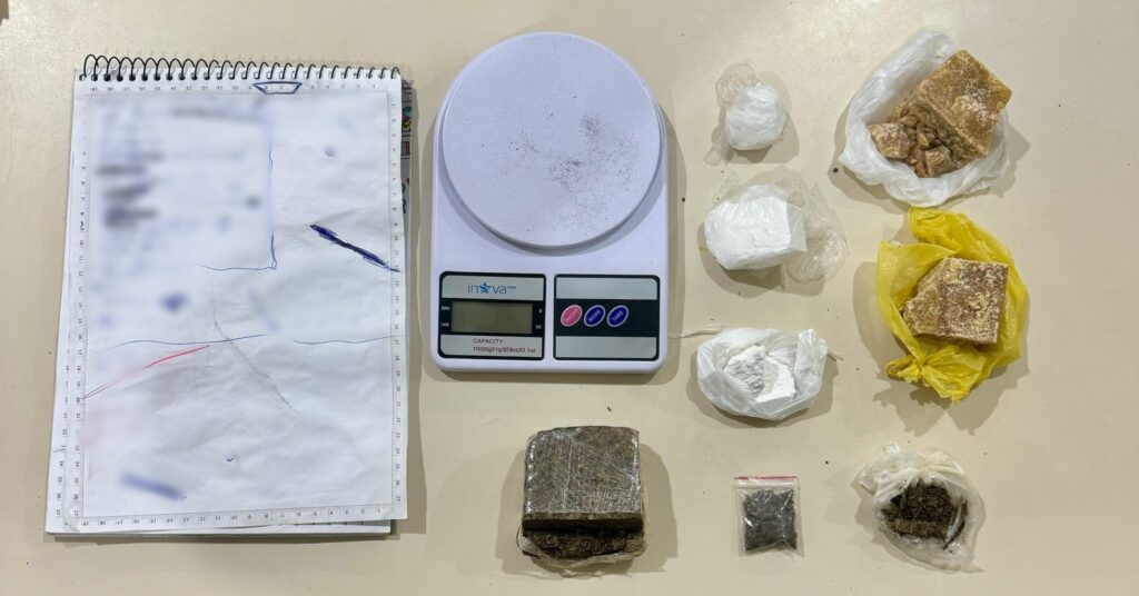 Com a autorização do pai de um dos indivíduos para a entrada dos policiais, a equipe realizou a busca domiciliar. No quarto do suspeito, foram localizados 3 gramas de maconha, um tablete de 143 gramas da mesma substância, 133 gramas de cocaína em três invólucros, 223 gramas de crack, uma balança de precisão e um caderno com anotações sobre o comércio dos entorpecentes.