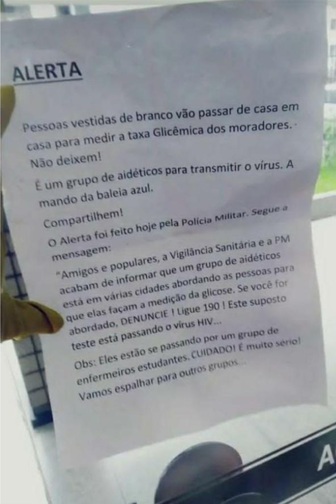 Uma mensagem alarmista tem circulado nos grupos de WhatsApp de Ortigueira nas últimas horas, causando preocupação infundada entre os moradores. O conteúdo, acompanhado da foto de um suposto cartaz de alerta, alega que falsos enfermeiros estariam visitando casas para realizar testes de glicemia com o intuito de transmitir doenças.