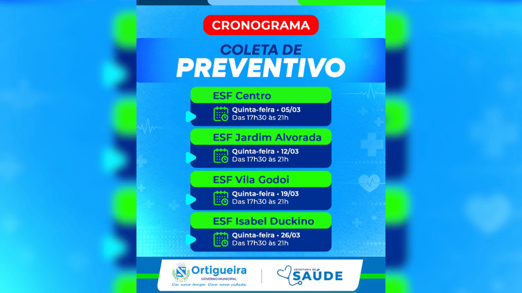 A Secretaria Municipal de Saúde de Ortigueira anunciou um cronograma especial de atendimento para este mês de março. As Unidades de Saúde do município estenderão os trabalhos nas quintas-feiras para facilitar a realização do exame preventivo pelas mulheres.